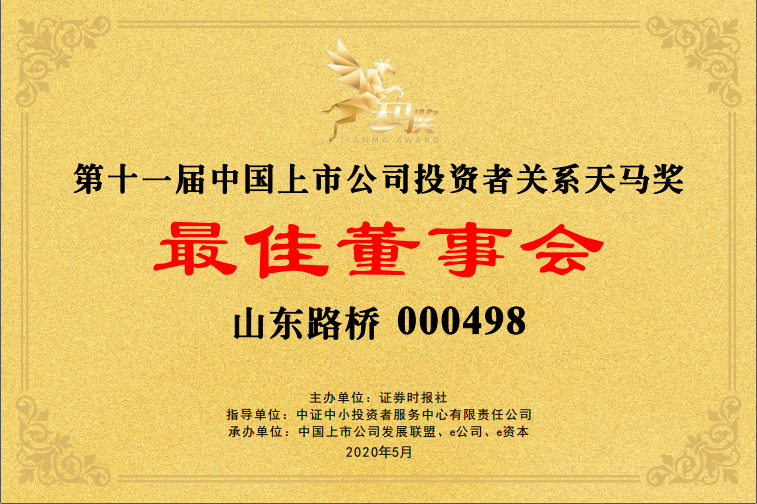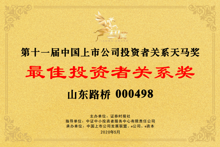 山東路橋第11屆中國(guó)上市公司投資者關(guān)系天馬獎(jiǎng)寄語(yǔ),黨委書(shū)記、董事長(zhǎng)王振江: 山東路橋堅(jiān)持生產(chǎn)經(jīng)營(yíng)和資本運(yùn)作“雙輪驅(qū)動(dòng)”,發(fā)展質(zhì)量和效益增長(zhǎng)“兩翼齊飛”。公司作為全國(guó)首批公路工程施工總承包特級(jí)資質(zhì)企業(yè),擁有施工“雙特級(jí)”和設(shè)計(jì)“雙甲級(jí)”等69項(xiàng)資質(zhì),先后參與全國(guó)三十幾個(gè)省市的路橋施工建設(shè),用一流的質(zhì)量樹(shù)立了信得過(guò)的“山東路橋”品牌形象。同時(shí),公司堅(jiān)持規(guī)范與發(fā)展并重,信披與治理并行,以“富員強(qiáng)企、通達(dá)天下”為使命,做讓投資者看得見(jiàn)、看得清的上市公司,打造基業(yè)長(zhǎng)青的百年老店。未來(lái),公司將充分把握高質(zhì)量發(fā)展契機(jī),不斷挖掘新的收入、利潤(rùn)增長(zhǎng)點(diǎn),走穩(wěn)健合規(guī)發(fā)展之路。扎根實(shí)體,練好內(nèi)功,突出主業(yè),弘揚(yáng)企業(yè)家精神和工匠精神,與投資者共享發(fā)展紅利。