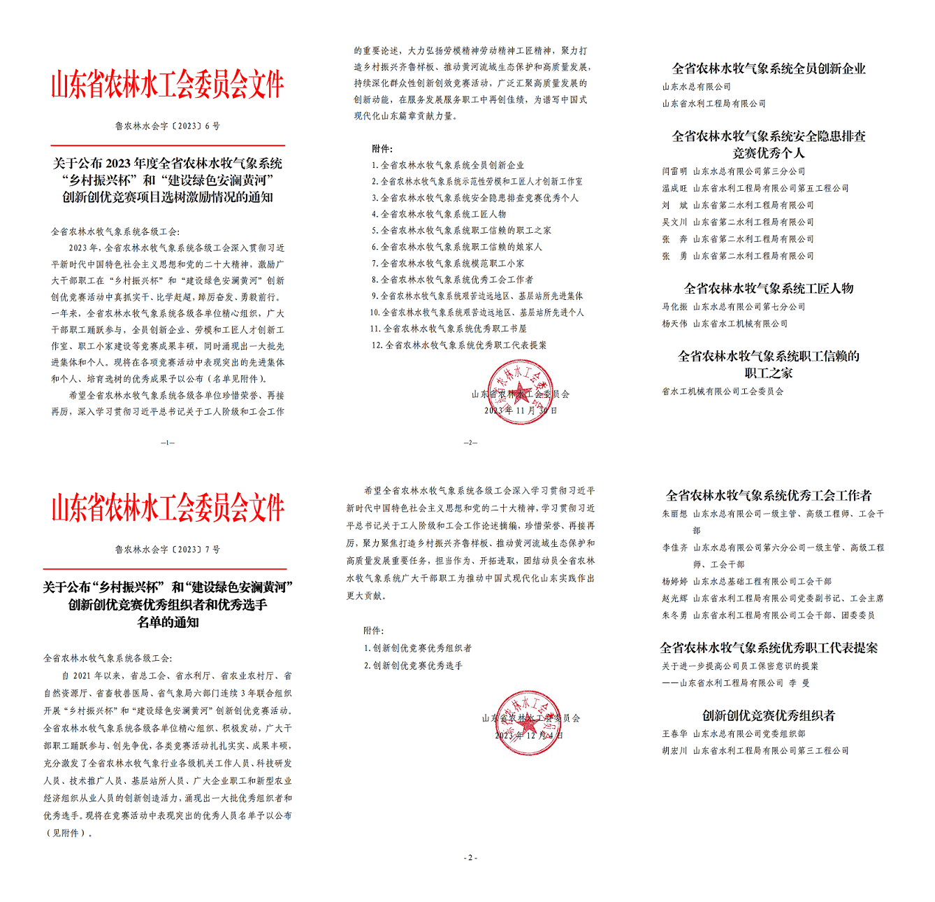 近日,山東水總、山東水局在山東省農(nóng)林水工會組織的山東省農(nóng)林水牧氣象系統(tǒng)“鄉(xiāng)村振興杯”創(chuàng)新創(chuàng)優(yōu)競賽中獲多項榮譽。其中,山東水總、山東水局獲“全省農(nóng)林水牧氣象系統(tǒng)全員創(chuàng)新企業(yè)”稱號,山東水總水工機械公司工會獲“職工信賴的職工之家”稱號,閆雷明等16名員工分別獲“安全隱患排查競賽優(yōu)秀個人”“工匠人物”“優(yōu)秀工會工作者”“優(yōu)秀職工代表提案”“創(chuàng)新創(chuàng)優(yōu)競賽優(yōu)秀組織者”等稱號。